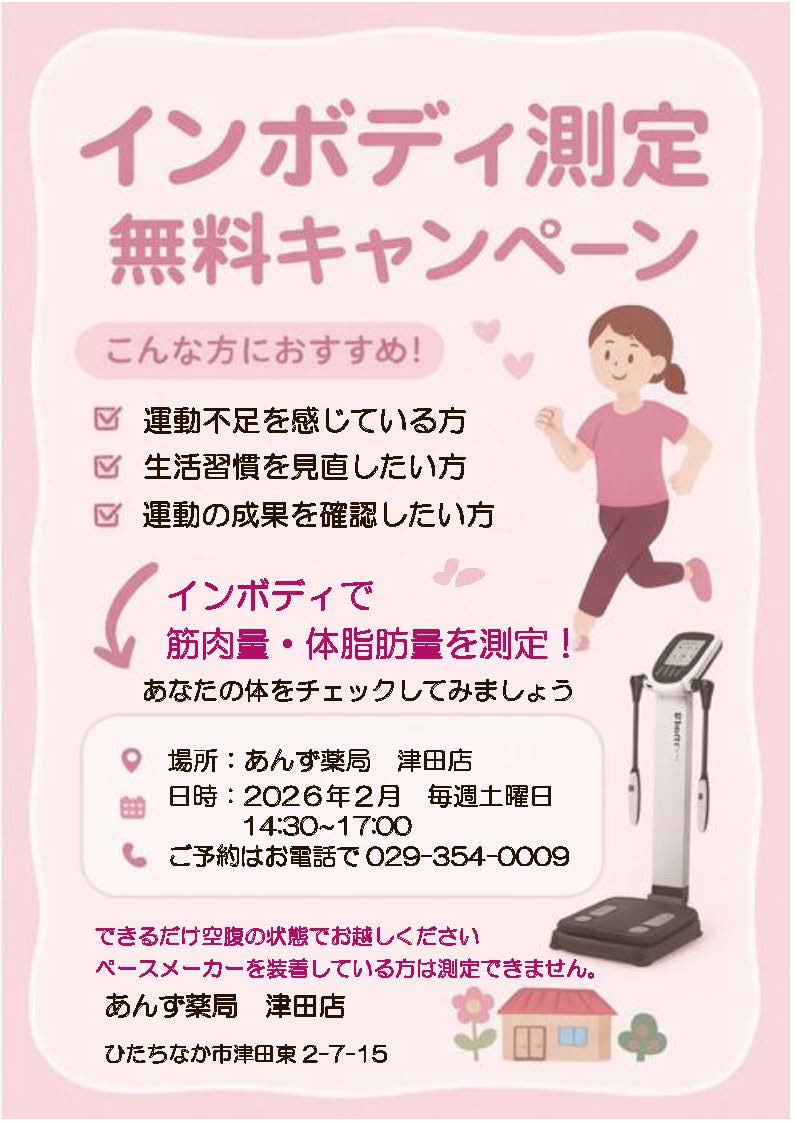 2026.1.26あんず薬局 津田店 ”InBody 測定キャンペーン”のお知らせ(無料) あんず薬局 津田店では、2月の毎週土曜日 ”InBody測定無料キャンペーン”を開催いたします。 ご […]